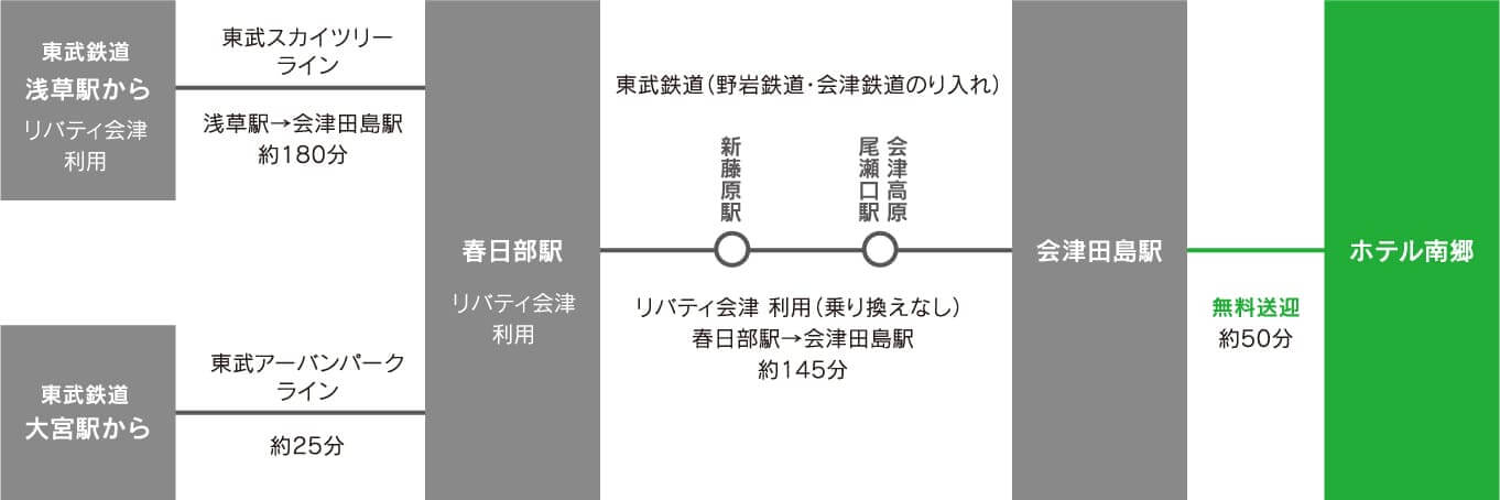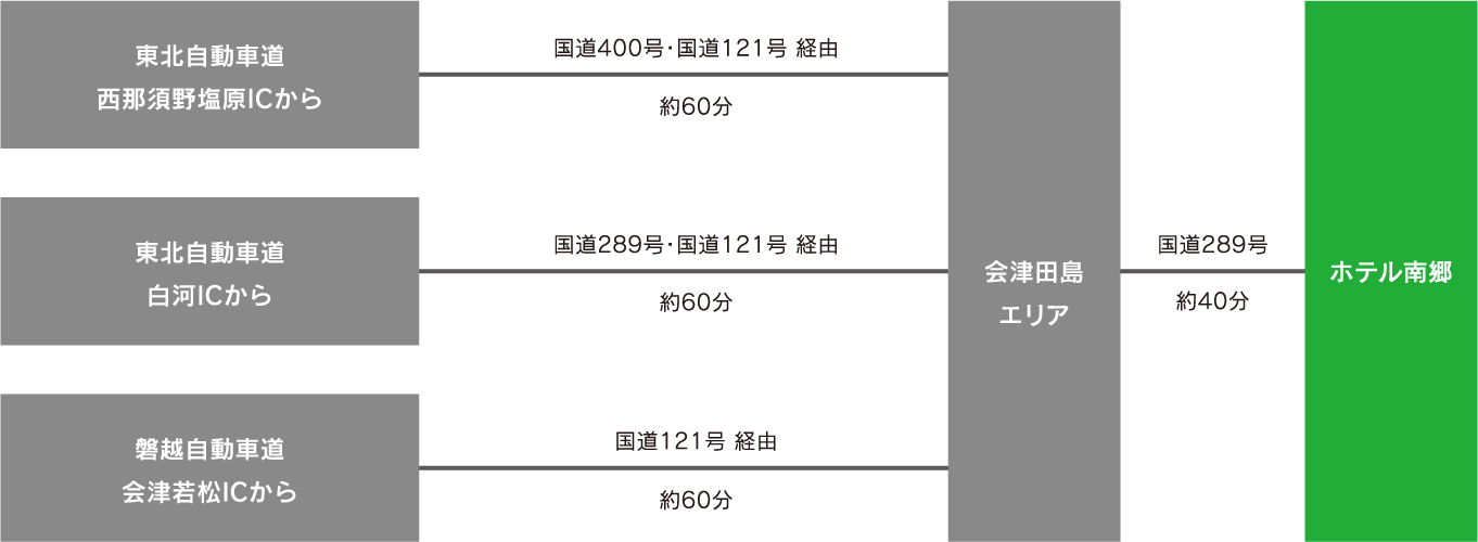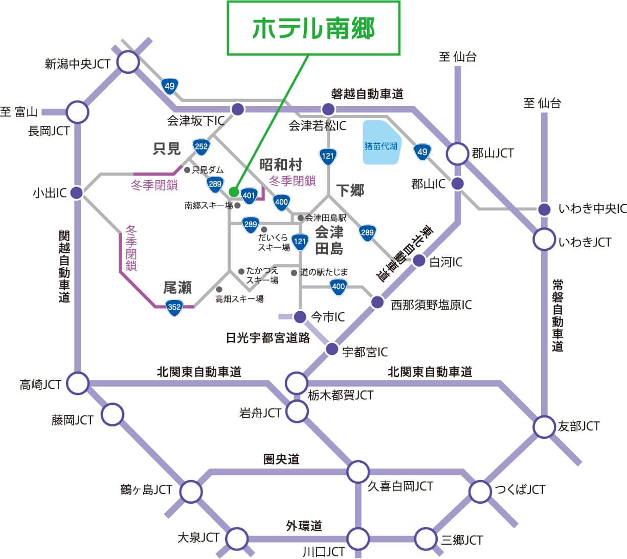 ※会津田島エリアからホテル南郷へは「国道289号」経由をおすすめいたします。 昭和村エリア経由(国道400号・401号)は道幅が狭く、 特に冬期間は昭和村エリア⇔ホテル南郷の一部区間が通行止めとなりますので、カーナビの経路設定にご注意ください。