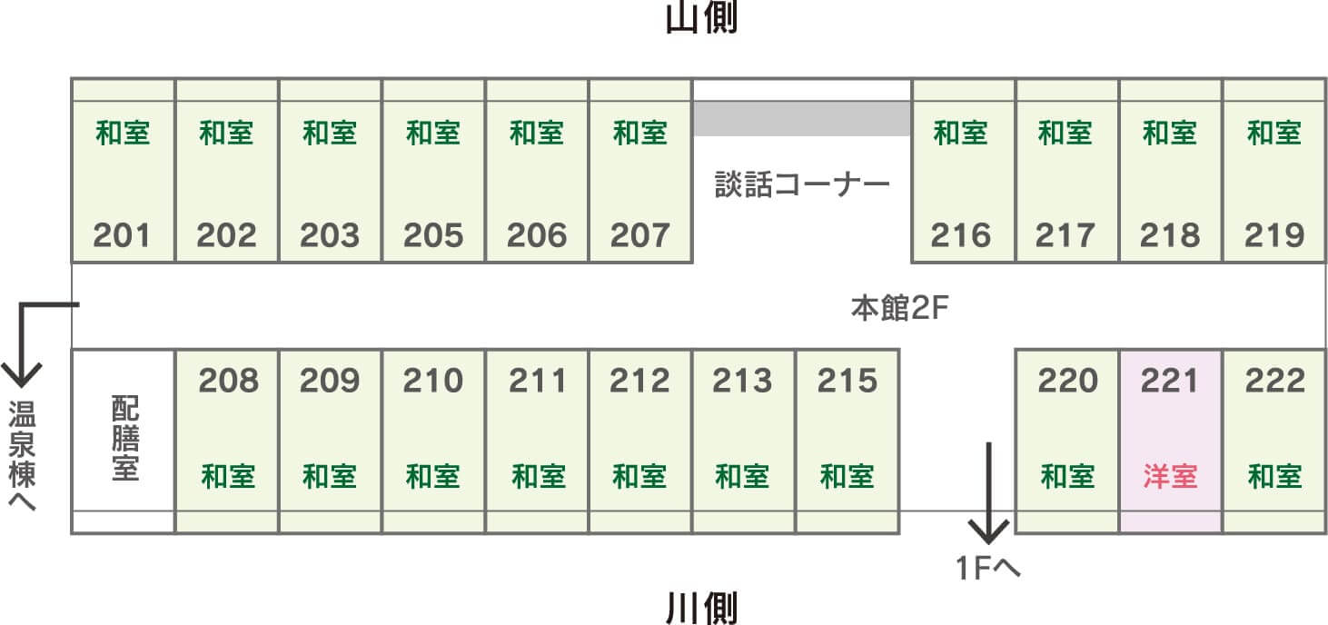 昔ながらの和の雰囲気を楽しめるお部屋です。 和室は全て2階となり、8畳(定員4名様)のお部屋が全19室(トイレ付)、廊下を挟んで川側と山側に面した配置となっております。